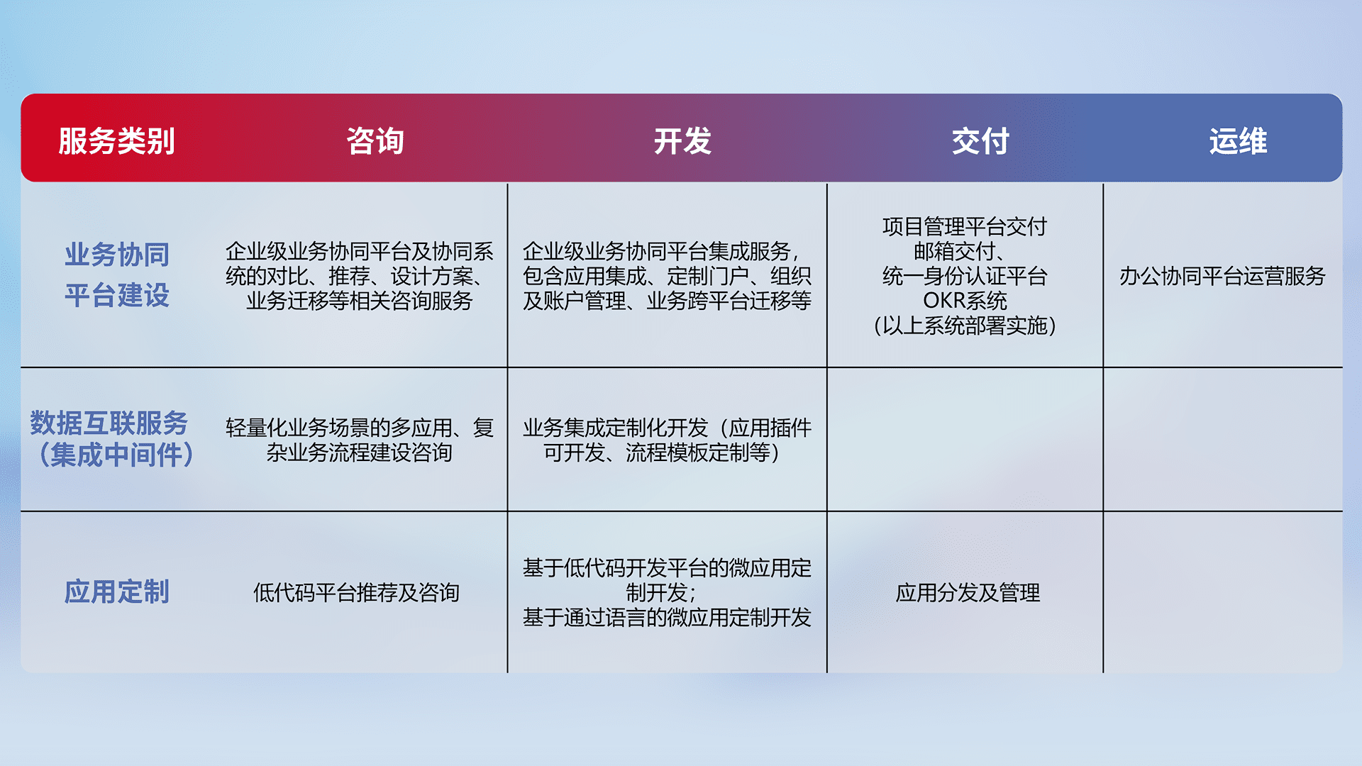 针对钉钉、、、企微、、、IDaas等平台级产品提供产品的规划、、、、方案、、、交付、、定制化开发等服务,,,实现如统一协同办公、、智能客户服务、、、、混合会议管理、、、、智能数据查询、、、等业务场景,,,实现数字化转型。。。。